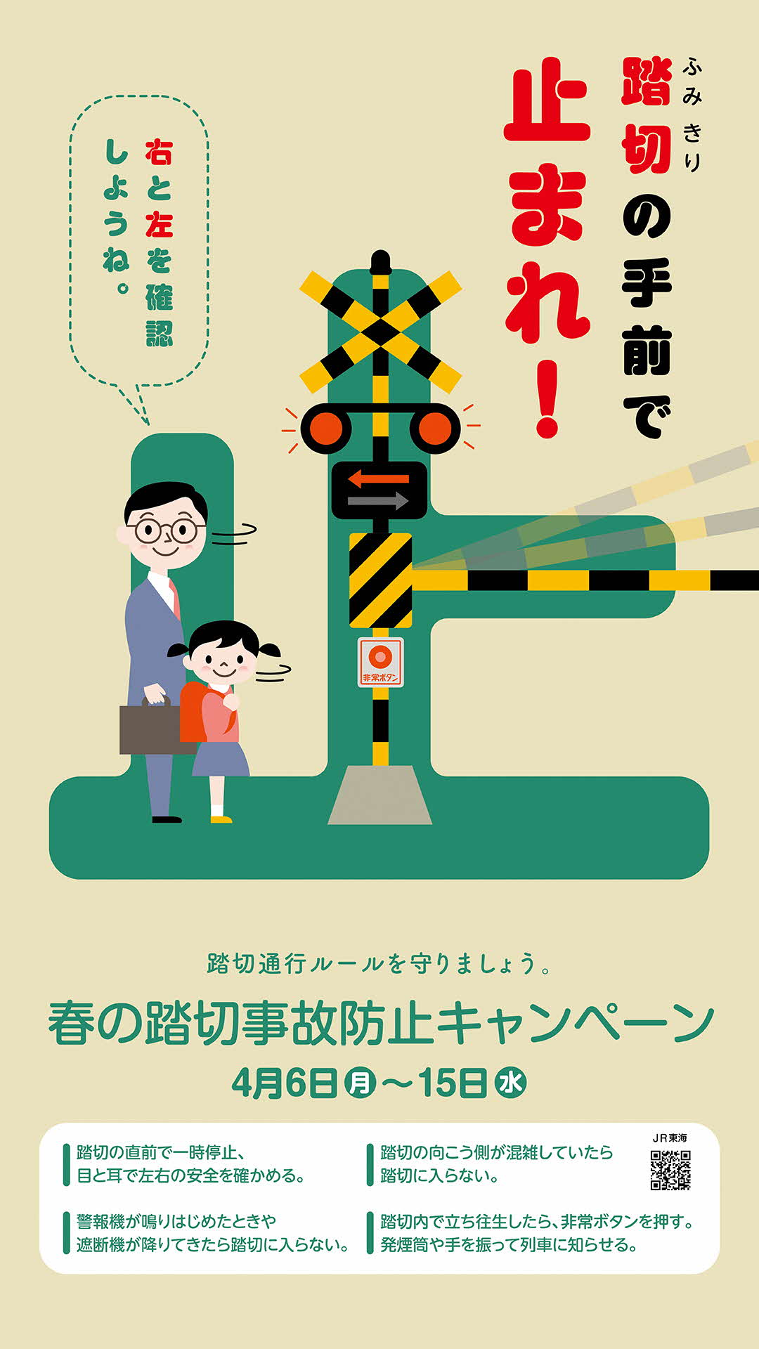 JR東海では、4月6日(月)から4月15日(水)の間、春の全国交通安全運動に合わせて、春の踏切事故防止キャンペーンを実施しております。 警報機が鳴っているときや、遮断機が閉じようとしているときは踏切の中に絶対に入らないでください。また、自動車で通行する場合には、踏切の手前での一時停止と前方のスペースを確認してから通行してください。 踏切事故防止にご協力をお願いいたします。