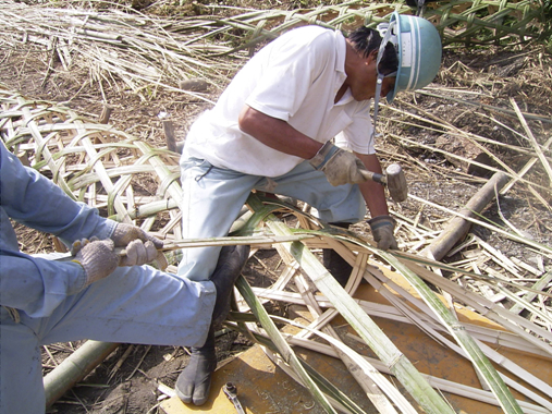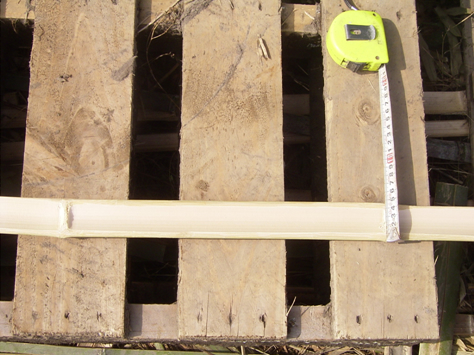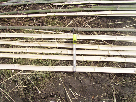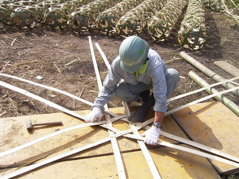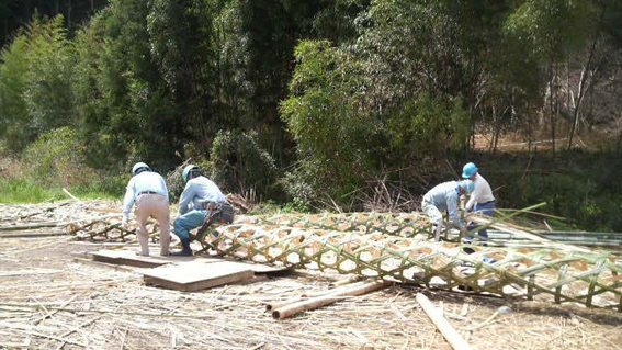 | ▼竹材の加工(割った)した状態、径45cmの篭で幅5cm |