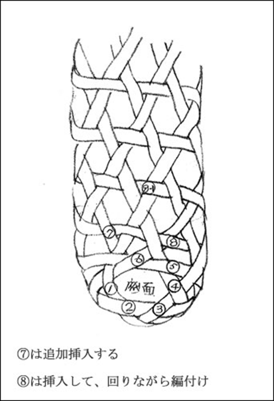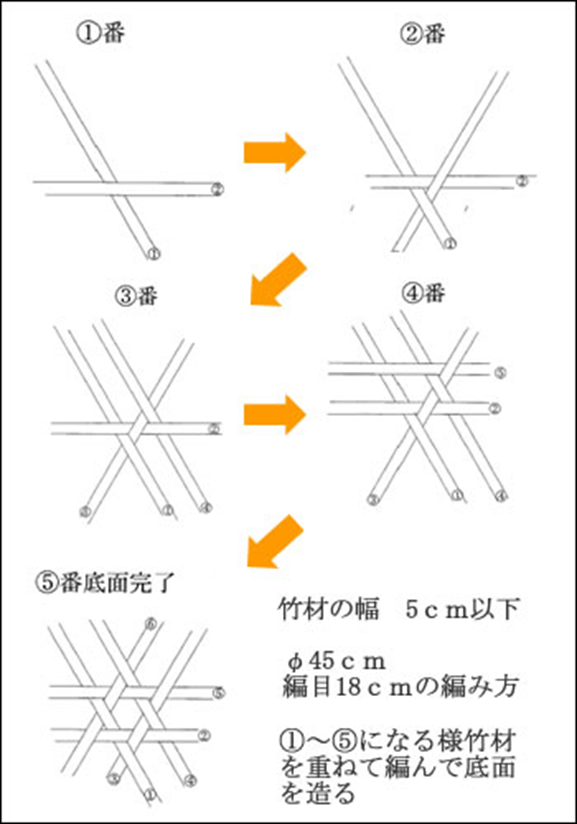 | (6) |  | 緑色の円形に見えるのが篭を丸く編む為の竹です、図のように底面の組方と反対になっる様に編み込みます。 |
